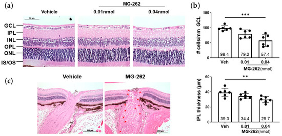 Proteasome inhibitor (MG-262) induced inner retinal degeneration in mice. (a) Representative images of hematoxylin and eosin staining of mouse retinae 7 days following intravitreal injection of 0.01 and 0.04 nmol/eye of MG-262, or its vehicle (10% dimethyl sulfoxide in Dulbecco’s phosphate buffered solution or D-PBS). Retinae were cross-sectioned, and their images were taken approximately 300 µm away from the optic nerve head. GCL: ganglion cell layer; IPL: inner plexiform layer; INL: inner nuclear layer; OPL: outer plexiform layer; ONL: outer nuclear layer; IS/OS: photoreceptor inner and outer segments. The scale bar shows 50 µm. (b) Quantification of number of cells in the GCL and IPL thickness measurement. Cell counting and thickness measurement were performed on ImageJ. N = 6 eyes from 3 mice per each treatment group. Each value represents the mean ± standard deviation with the mean value indicated at the bottom of each bar. Statistical analysis was performed with one-way analysis of variance, followed by Dunnett’s post hoc test. ** p < 0.01 *** p < 0.001, vs. vehicle (Veh). (c) Representative images of the optic nerve of eyes, injected with 0.01 nmol/eye of MG-262. Vacuolation (red arrow heads) was observed throughout the optic nerve in eyes injected with MG-262. The scale bar shows 200 µm.