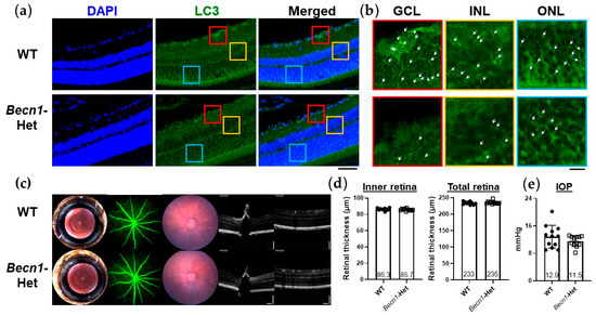 We then determined if any ocular abnormality may be present in Becn1-Het mice. As shown in Figure 2c,d, a series of clinical imaging, namely, slit lamp photography, fundus photography, and fundus fluorescent angiography, failed to detect noticeable differences in the morphology of the cornea, the lens, and the retina between WT and Becn1-Het mice. Optical coherence tomography further confirmed that the structure of the optic nerve head, as well as the inner and total retinal thickness (Figure 2c,d) of these mice were normal. Additionally, intraocular pressure (IOP) was maintained in the normal range in both groups of mice (Figure 2e). Overall, despite autophagic dysfunction found in the retina of these mice, the eyes of Becn1-Het did not display any abnormality in their morphology and structure or IOP under normal conditions.