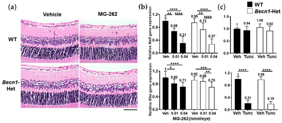 Beclin1-heterozygous mice (Becn1-Het) and wild-type (WT) mice are equally sensitive to retinal degeneration, induced by proteasome inhibition and endoplasmic reticulum (ER) stress. Chemicals, or their vehicle, were intravitreally injected into the eyes of WT and Becn1-Het mice, and eyes were isolated 7 and 4 days post-injection for histological evaluation (a) and gene expression analysis (b,c), respectively. Quantitative PCR was performed for neurofilament light chain (Nefl) and rhodopsin (Rho) genes. Each expression value was normalized to glyceraldehyde-3-phosphate dehydrogenase (Gapdh), the housekeeping gene, in individual samples and is shown relative to that obtained in the WT vehicle group. (a) Representative images of hematoxylin and eosin-stained retinae, following intravitreal injection of 0.01 nmol/eye MG-262 or its vehicle (10% dimethyl sulfoxide or DMSO in Dulbecco’s phosphate buffered solution or D-PBS). The scale bar shows 50 µm. (b) Effects of MG-262 (0.01 and 0.04 nmol/eye) or its vehicle (Veh, 10% DMSO in D-PBS) on Nefl and Rho gene expression levels in the retina. N = 8 to 16 eyes from 4 to 8 mice per each group. Black and while bars show WT and Becn1-Het, respectively. (c) Effects of tunicamycin (Tunc, 2.5 µg/eye) or its vehicle (Veh, 25% DMSO in D-PBS) on Nefl and Rho gene expression levels in the retina. N = 5 to 8 eyes from 4 mice per each group. Each value represents the mean ± standard deviation with the mean value indicated at the top of each bar. For statistical analysis, a two-way analysis of variance was performed, followed by Sidak’s post hoc test. * p < 0.05, ** p < 0.01, *** p < 0.001, **** p < 0.0001 for each pair of comparison.