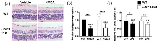 To extend our findings to other types of retinal degeneration models, we asked if excitotoxicity- and neuroinflammation-induced RGC death could be modified in Becn1-Het mice. IVT injection of N-methyl-D-aspartate (NMDA, 20 nmol/eye), an authentic NMDA receptor-coupled channel agonist [38,39], led to cell loss in the GCL and IPL thinning, accompanied by a remarkable reduction in Nefl gene expression levels (Figure 4a,b). Similarly, lipopolysaccharide (LPS, 2 µg/eye), a pro-inflammatory substance [40], caused a mild but statistically significant reduction in Nefl gene expression. Similar to the retinal degeneration induced by MG-262 and tunicamycin IVT injection, we did not observe any statistically significant difference in the retinal structural changes and reduction in Nefl gene expression upon IVT injection of NMDA or LPS between WT and Becn1-Het mice (Figure 4b,c).