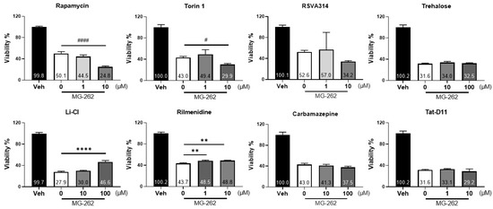 Autophagy activators could alleviate MG-262-induced cytotoxicity. Human neuroblastoma cells, SH-SY5Y, were treated with a series of different autophagy activators, as indicated, 1 h prior to treatment with 0.2 µM MG-262 or its vehicle (0.1% dimethyl sulfoxide in Dulbecco’s Modified Eagle’s Medium) for 24 h, and cell viability was measured by WST-1 assay. All experiments were performed in triplicate and each value is shown as a percentage of that obtained in the vehicle group. Statistical test was performed with one-way analysis of variance, followed by Dunnett’s post hoc test. Each value represents the mean ± standard deviation with the mean value indicated at the bottom of each bar. ** p < 0.01, **** p < 0.0001, statistically significant increase in cell viability compared with the respective vehicle group; # p < 0.05; #### p < 0.0001, statistically significant reduction in cell viability compared with the respective vehicle group.