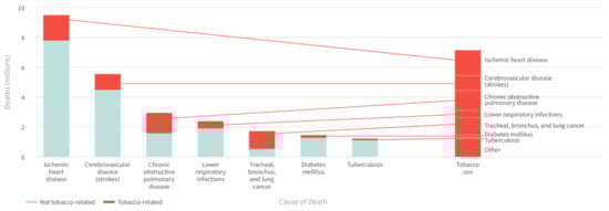 Tobacco use contributes to the leading causes of global deaths including non-communicable diseases as well as infectious diseases. Reused from The Tobacco Atlas, 6th edition with permission. Copyright ©2018 The American Cancer Society, Inc. [3].