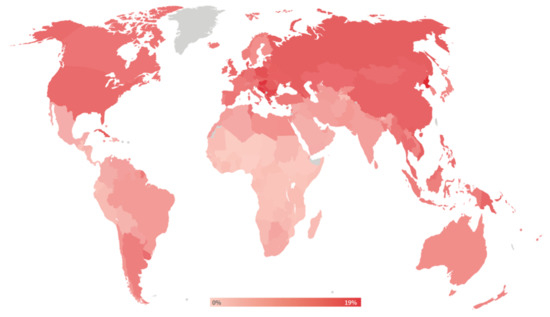 The latest issue of the Global Burden of Disease study (GBD) from 2019 ranked smoking as the second highest risk factor for attributable disability-adjusted life years (DALYs) [4]. The same study reported that only in Europe 10 to 20% of all DALYs could be attributed to smoking (Figure 2). This finding is not surprising when considering that almost all of the known non-communicable disease groups were at some point correlated with tobacco smoking [5]. Traditionally, smoking was associated with higher incidence of lung cancer and respiratory disease [6], but modern analytical methods and large clinical trials have expanded on these findings [7]. The high amount of toxic compounds generated by the burning of tobacco cigarettes (over 9000 different chemical compounds [8] has been found to play a role in onset and progression of many diseases such as cardio- and neurovascular diseases, metabolic diseases, and neuropsychiatric diseases. Most of the toxic chemical groups found in tobacco smoke are labeled as carcinogenic such as tobacco specific nitrosamines and polycyclic aromatic hydrocarbons [9,10]. Other common chemical groups like volatile organic compounds, that easily pass the blood-brain barrier, and carbonyl compounds, that can create protein adducts, can be implicated in many different diseases beside cancer [11,12]. Carbon monoxide, a product of incomplete burning, is also present in tobacco smoke and is a known human toxicant [13]. Since tobacco smoking is usually not an acute but rather a chronic exposure, accumulated toxic material can affect a whole spectrum of diseases.