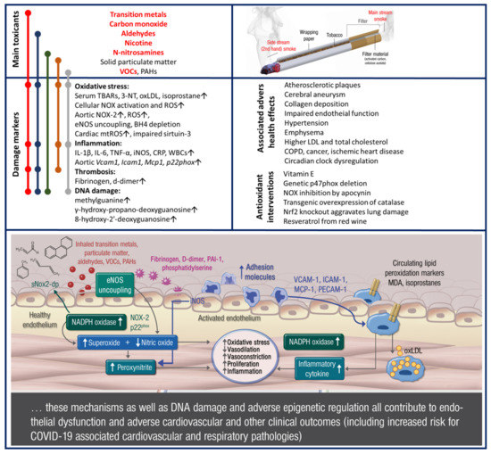 Toxic compounds, pathomechanisms, and adverse health effects of smoking as summarized from human and animal studies: The major toxicants (red and bold = high quantity, black = intermediate quantity) that are associated with smoking are listed along with a schematic description of the specific features of a tobacco cigarette. The molecular link between these toxicants and major damage markers reported for smoking with respect to oxidative stress is shown on the left side. The effects of these toxicants on endothelial (vascular) function are summarized in the inserted scheme. The associated adverse health effects as well as antioxidant interventions are also shown. Modified from Münzel et al. [41] with permission. Copyright © 2020, Oxford University Press.