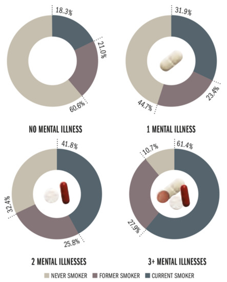 Prevalence of smoking among people with lifetime mental illnesses or psychological distress, comprising bipolar disorder, dementia, schizophrenia, phobias/fears, attention deficit/hyperactivity, and serious psychological distress. Prevalence of current smoking increased with higher numbers of mental illness, ranging from 18.3% for subjects with no illness to 61.4% for subjects with three or more mental illnesses. Reused from The Tobacco Atlas, 5th edition with permission. Copyright ©2015 The American Cancer Society, Inc. [101].