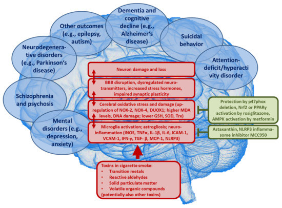 The link between oxidative stress and neuronal damage is evident from numerous reports. Some of the major toxic compounds in cigarette smoke are especially well known to cause systemic and cardiovascular oxidative stress (Figure 3), which also holds true for the brain, as reported for particulate matter [152], heavy/transition metal ions [153,154,155], reactive aldehydes [156,157,158], and volatile organic compounds [159]. The following animal experimental studies support oxidative stress-mediated neuronal damage that may contribute to the aforementioned neuropsychiatric disease in smokers. Rosiglitazone, by induction of PPARγ and Nrf2 activity, protects against cigarette smoke-induced loss of blood-brain-barrier integrity via reduced inflammation and oxidative stress [160]. Chronic cigarette smoke exposure drives spiral ganglion neuron loss in mice [161]. The neurotoxic effects of smoking were further supported by cerebral aneurysm development and ROS formation by cigarette smoke extract and a central role of the phagocytic NADPH oxidase in this process was demonstrated by an improvement of the adverse phenotype by genetic p47phox deletion [162]. Maternal cigarette smoke exposure also enhanced brain inflammation and oxidative stress in male mice offspring [163]. Oxidative stress induced by cigarette smoke in Lewis rat brains was evident by increased brain gene expression for the pro-oxidants iNOS and the NADPH components NOX4, dual oxidase 1, and p22phox as well as decreased levels of serum levels of glutathione and, in the brain, similar levels of superoxide dismutase and decreased thioredoxin [164]. Cigarette smoke exposure also induced various types of oxidative DNA damage, including single-strand breaks, double-strand breaks, and DNA-protein cross-links in the brain of neonatal mice, all of which were associated with the oxidative stress marker malondialdehyde and represent important risk factors for both neurodevelopmental and neurodegenerative disorders [165]. Accordingly, moderate exercise prevented cigarette smoke exposure-induced hippocampal oxidative stress (malondialdehyde and protein carbonyls) and adverse neurological behaviors in mice [166]. In cultured cells, these adverse effects were confirmed by higher cellular ROS formation and induction of the stress-response by NRF-2, as well as by impaired blood-brain-barrier function. In vivo, the adverse effects on stroke damage were normalized by metformin treatment, which is known to confer antioxidant protection by AMPK activation [167].