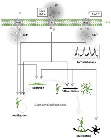 Oligodendrogliogenesis is differentially regulated by voltage-gated ion channels. Schematic representation of voltage-gated Na+, K+, Ca2+ channel (Nav, Kv, Cav) effects on oligodendrogliogenesis. Nav contributes to oligodendrocyte precursor cell (OPC) proliferation and migration. Kv regulates proliferation and differentiation. Cav regulates all steps of oligodendrogliogenesis. In particular, Cav activation contributes to spontaneous Ca2+ oscillations leading to accelerated migration, process formation (differentiation) and myelination. The most expressed ion channels, within each ion-selective group, are represented in the sidebar upwards.