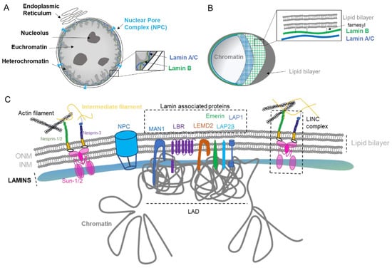 Other important constituents of the lamina are the lamin-associated proteins that mediate the attachment of lamins to the nuclear envelope. Their role is to assist lamins in regulating the chromatin, as exemplified by Lamin B Receptor (LBR) that interacts with several histone modifiers [19], as well as facilitating mechanotransduction as for Emerin [20] and regulating signaling pathways such as TGFβ by MAN1 [21] (Figure 1C). The diversity of lamin-associated proteins justifies the various roles and functions played by the nuclear lamina.