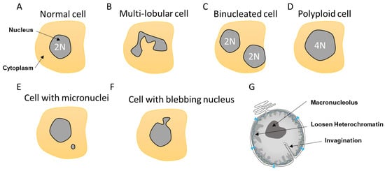 Different nuclear abnormalities. (A) Classical cells have one single round nucleus that contains a diploid genome (2N). (B) Cells such as neutrophils possess multi-lobar nucleus. (C,D) Polyploid cells (>4N) can either have two or more separated nuclei or one enlarged nucleus. (E) Some cells can have a smaller nucleus, which is called a micronucleus, in their cytoplasm. Micronuclei contain a full chromosome or a piece thereof. (F) Nuclei can also display blebbing characterized by an outward extension of the nuclear envelope (NE). (G). In addition, cancer cells can show abnormalities such as NE invagination, loosen heterochromatin as a consequence in changes in DNA compaction as well as a single and bigger nucleolus, which is called a macronucleolus.
