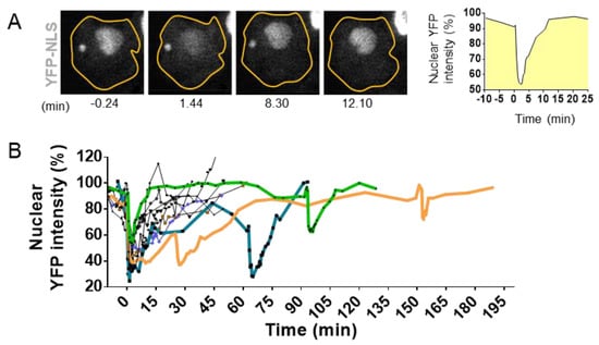 Visualization and quantification of nuclear envelope disruption (NED). (A). Time lapse imaging of migrating MCF10A cells treated with TGFß and stably expressing the fluorescent markers YFP linked to the Nuclear Localization Signal (YFP-NLS) [74]. Confocal imaging in YFP channel and bright field allows the visualization of sudden leakage of YFP-NLs into the cytoplasm, showing a loss of proper compartmentalization of the nucleus during 8.30 mn and the loss of compartmentalization of the micronuclei at 12.10 mn of time. (B). Graph shows nuclear fluorescence intensity changes upon time in 10 cells with events of interphase NED/nuclear envelope repair observed in TGFß-treated MCF10A cells. Bold colored lines highlight repetitive NED events from the same cell. Adapted from Comaills et al. [10].