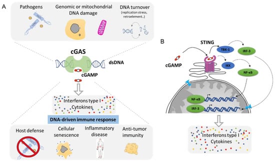 Mechanistically, cGAS activation by cytosolic DNA leads to the generation of cyclic GMP–AMP (cGAMP), which binds to the receptor STImulator of INterferon Genes (STING). Activation of STING results in the activation of TANK-binding kinase 1 (TBK1) and in the dimerization and nuclear translocation of the interferon regulatory transcription factor 3 (IRF3), resulting in the transcription of genes encoding type I interferons (reviewed in [100,101]) (Figure 6B). DNA sensing through the cGAS–STING pathway also results in the activation of the nuclear factor NF-κB through IKK and leads to the transcription of pro-inflammatory cytokines such as IL-6 and tumor necrosis factor (TNF) [102]. This cocktail of signal attracts, alerts, and activates the immune system of a potential danger. Then, the cGAS pathway is involved in several functions such as host defense in response to bacterial or viral infection. It supports the natural antitumor activity by facilitating the recognition of cellular damage and in promoting cellular senescence [100,103,104] (Figure 6A). However, the cGAS/STING pathway plays also a crucial role in many inflammation-related diseases such as cardiovascular disease, neurodegenerative disease, inflammatory bowel disease, metabolic syndrome such as diabetes, fibrosis, lupus, arthritis, and psoriasis [100,105,106] (Figure 6A).
