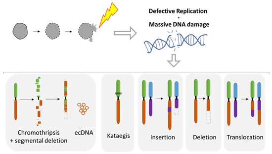 The MN shelters either an intact chromosome or a fragment thereof as a result of aberrant mitosis. MN formation can be induced in vitro using either mitotic spindle inhibitors (e.g., Nocodazole release) [71,107,109] or by impairing the kinetochore attachment on the Y chromosome [108], thus allowing the study of chromosome instability. Indeed, MN are a site of intensive DNA damage as observed with the DNA damage marker gamma H2AX [71,109,110]. As the nuclear envelope of MN tends to disrupt and is unable to repair [71], this process can lead to massive DNA damage, ultimately producing chromosome fragmentation and pulverization [71,107,110,111] (Figure 7). Deficiency of MN nuclear envelope composition [82] can also be responsible for defective replication in both intact and disrupted MN [109,110]. The lack of proper replication leads to a desynchronization during the mitosis, resulting in massive DNA breaks during metaphase [109,110] and leading to chromosome pulverization. Pieces of pulverized chromosome can randomly reassemble, leading to chromothripsis, which is characterized by up to one hundred chromosomal rearrangements that occur all at once (Figure 7). MN generates chromothripsis at remarkably high rates [83,107,112,113,114]. It is also important to note that chromothripsis is associated with segmental deletion and the production of circular extrachromosomal DNA (ecDNA) amplification (also known as double minutes) [108,115]. ecDNAs are found in nearly half of cancers and contribute to oncogene amplification as well as to tumor genetic heterogeneity [116]. MNs can also result in other types of chromosomal rearrangements such as deletion, insertion, or translocation events as well as kataegis, which is a pattern of localized hypermutations [108].