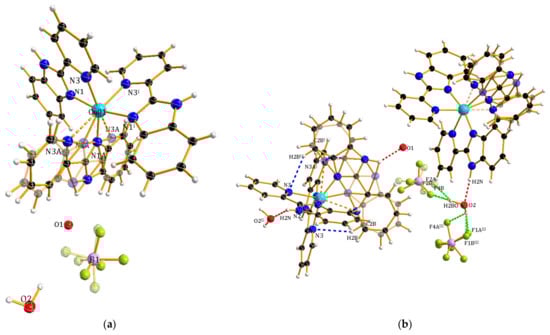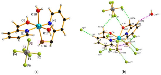| [Cu(C11H10N2O2)2](BF4)2·2H2O [35] | BF4− | Monoclinic, P21/c | 2.4312(17) 2.4312(17) | 2.0099(19) 2.0146(19) 2.0147(19) | - | {CuN4O2] | κ3N,O,N′ |
