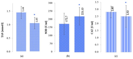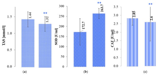 | TAS (mmol/L) | 1.44 ± 0.33 (1.25–1.63) | 1.05 ± 0.16 (0.78–1.32) | 1.32 ± 0.26 (1.16–1.63) |