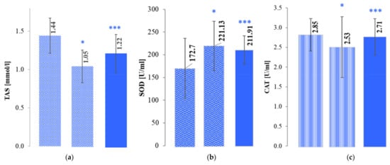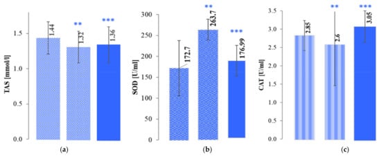 | CAT (U/mL) | 2.85 ± 0.41 (2.30–3.39) | 2.53 ± 0.77 (1.42–3.25) | 2.60 ± 1.12 (1.03–4.65) |