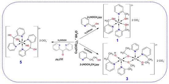 3.2.1. Synthesis of [Cu(2-(HOCH2)py)3](ClO4)2 (1)