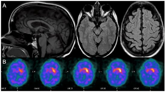 Brain magnetic resonance imaging (MRI) and single-photon emission computed tomography (DaTscan) obtained four years after symptom onset. (A) Brain MRI Left panel: mid-sagittal T1-weighted sequence with mild vermal cerebellar atrophy and midbrain atrophy (midbrain anteroposterior diameter, 8.6 mm; midbrain-to-pons ratio 0.54) []; central panel: axial T2 FLAIR sequence showing mild tegmental midbrain atrophy; right panel: axial T2 FLAIR sequence showing two small white matter hyperintensities. (B) DaTscan showed asymmetric (right > left), abnormally decreased uptake in the bilateral putamen and right caudate.