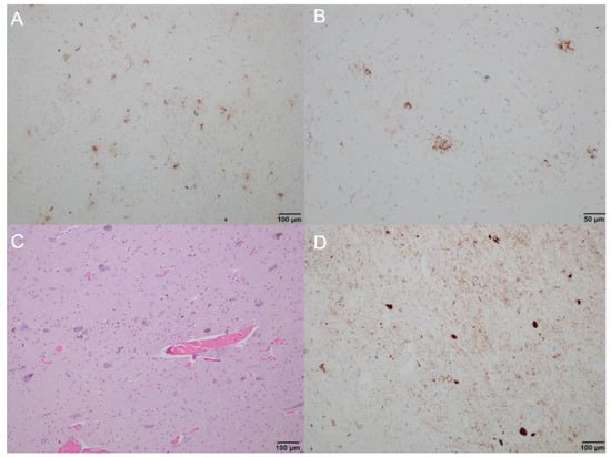 Brain neuropathology, microscopic anatomy: (A) immunohistochemistry staining showing tau accumulation in the putamen, predominantly in the form of tufted astrocytes and tau-positive neurons (100× magnification); (B) immunohistochemistry staining showing tufted astrocytes in the caudate nucleus (200× magnification); (C,D) substantia nigra showing neuronal cell loss, tau-positive neurons, and numerous neuropil threads ((C) hematoxylin and eosin staining; (D) immunohistochemistry staining; 100× magnification).