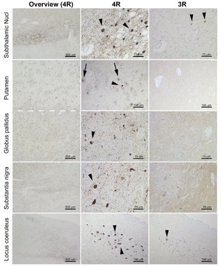Immunostaining for 4R (left and middle column) and 3R (right column) tau isoforms in the subthalamic nucleus, putamen, globus pallidus, substantia nigra, and locus coeruleus. Note that the pathology is predominated by 4R tau deposition and shows tufted astrocytes (few examples indicated by arrows), globose neurofibrillary tangles (few examples indicated by arrowheads), and coiled bodies (few examples indicated by asterisks). Only a single 3R tau immunoreactive neurofibrillary tangle is seen in the locus coeruleus (arrowhead), and two are seen weakly stained in the subthalamic nucleus (arrowheads).