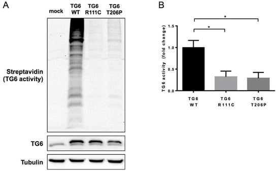 In vitro assay showing TG6 transamidase activity: (A) Western blotting analysis showed significantly compromised transamidase activity of the TGM6 T206P variant compared to wild-type TG6 protein. (B) Quantification of TG6 enzymatic activity from experiment shown in panel A. Graph, mean ± SEM, * p <0.05, one-way ANOVA with Tukey’s post hoc test. Y-Axis represents the fold change.