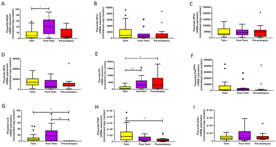 mRNA expression assessed by quantitative reverse-transcription PCR of (A) NADPH oxidase (NOX4), (B–D) glutathione peroxidases 1, 3, and 4 (GPx1, 3, and 4), respectively, (E) cyclin-dependent kinase inhibitor (P21), (F) cyclin-dependent kinase inhibitor 2A (P16INK4α), (G) interleukin-6 (IL-6), (H) placental growth factor (PlGF), and (I) soluble fms-like tyrosine kinase-1 (sFlt-1) in placentae from term normotensive (37–40 + 6 weeks; n = 26), post-term normotensive (41–42 weeks; n = 11), and women who had pre-eclampsia (n = 13). Data are presented as median [IQR]; * p < 0.05, ** p < 0.005.