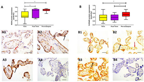 Protein expression assessed by immunohistochemistry. (A) NADPH oxidase (NOX4) and (B) 8-hydroxy-2′-deoxy-guanosine (8-OHdG) in placentae from term normotensive (37–40 + 6 weeks; n = 26), post-term normotensive (41–42 weeks; n = 11), and women who had pre-eclampsia, delivered at 31 + 2 to 41 + 2 weeks gestation (n = 13). Data are presented as median [IQR]; * p < 0.05. Photomicrographs show typical examples of immunostaining in (A1,B1) term, (A2,B2) post-term, (A3,B3) pre-eclampsia, and (A4,B4) IgG negative control. Positive protein expression appears brown and is localised mainly to the syncytiotrophoblast (black arrows) but is also evident in the nuclei (red arrows); scale bar = 100 μm.