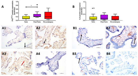 Protein expression assessed by immunohistochemistry. (A) P16INK4a and (B) interleukin-6 (IL-6) in placentae from term normotensive (37–40 + 6 weeks; n = 26), post-term normotensive (41–42 weeks; n = 11), and women who had pre-eclampsia (n = 13). Data are presented as median [IQR]; * p < 0.05. Photomicrographs show typical examples of immunostaining in (A1,B1) term, (A2,B2) post-term, (A3,B3) pre-eclampsia and (A4,B4) IgG negative control. Positive protein expression of P16INK4a appears brown and is localised mainly to the syncytiotrophoblast (black arrow) with some stromal cell staining (red arrow); that of interleukin 6 is found mainly in endothelial cells (arrows); scale bar = 100 μm.