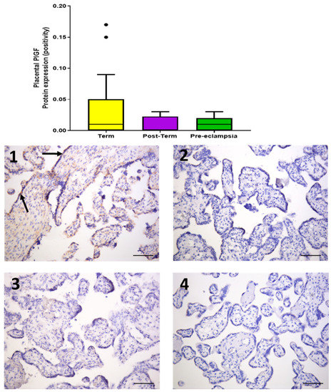 Protein expression of placental growth factor (PlGF) assessed by immunohistochemistry in placentae from term normotensive (37–40 + 6 weeks; n = 26), post-term normotensive (41–42 weeks; n = 11), and women who had pre-eclampsia (n = 13). Data are presented as median [IQR]. Photomicrographs show typical examples of immunostaining in (1) term, (2) post-term, (3) pre-eclampsia, and (4) IgG negative control. Positive protein expression is weak and appears brown, localised mainly to the syncytiotrophoblast (black arrows); scale bar = 100 μm.
