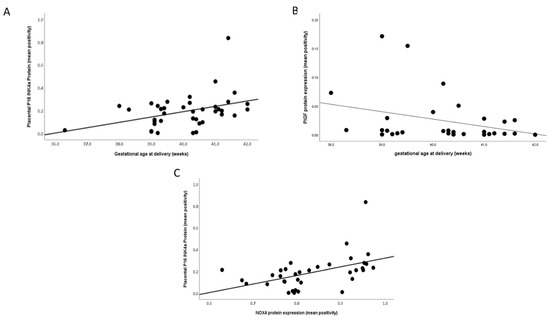 Again, when considering the impact of gestational age at delivery in only the normotensive women, a positive association was evident with placental P16INK4a expression (r = 0.331; p = 0.04; Figure 5A). In contrast, a negative correlation was seen with PlGF expression (r = −0.367; p = 0.046; Figure 5B). In addition, placental expression of P16INK4a and NOX4 were positively correlated (r = 0.537; p = 0.001; Figure 5C).