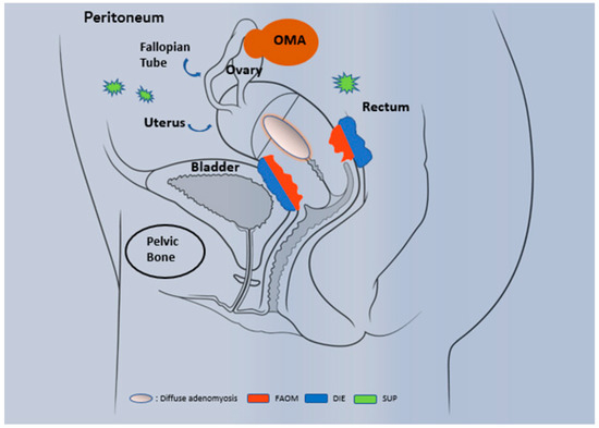 Histologically, endometriosis is characterized by the presence of endometrial glands and stromal tissue that develop as endometrium-like structures outside the uterus. Generally, the organs affected are the ovary (endometrioma OMA), the peritoneum (superficial endometriosis SUP), the retroperitoneum and the anatomic structures located near the uterus, as for instance: uterosacral ligaments, bladder, rectum and ureters (Figure 1). In addition, the lesions can affect the myometrium and then constitute adenomyosis lesions that share many features with ‘classical’ endometriosis, and were once called endometriosis interna.