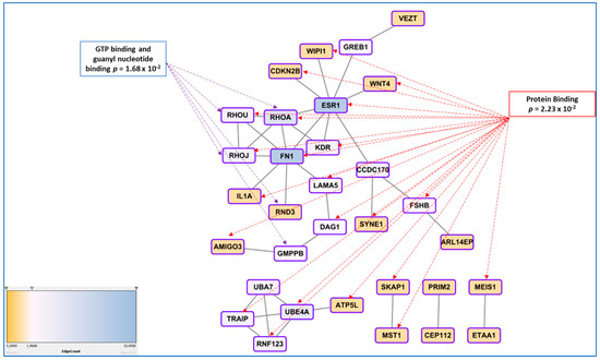 A significantly enriched gene network is constructed from the list of genes found through GWAS approaches using the online tools STRING and Cytoscape, that allowed to identify hubs (genes with the highest degree of connection, ESR1 and FN1). Functional annotation using BINGO led to discover the most enriched molecular functions, connected to GTP metabolism and Protein binding, in a broad sense. The Edge count associated with the color is proportional to the number of links connecting the different genes.