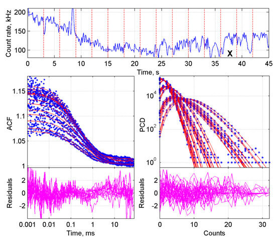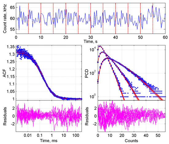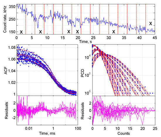 - Skakun, V.V.; Digris, A.V.; Apanasovich, V.V. Global analysis of autocorrelation functions and photon counting distributions in fluorescence fluctuation spectroscopy. Methods Mol. Biol. 2014, 1076, 719–741. [Google Scholar] [CrossRef]