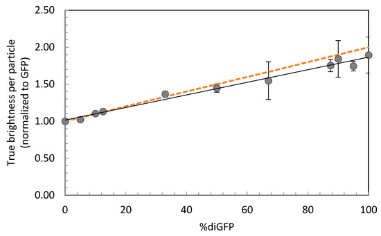 Average brightness of various GFP-diGFP mixes in cell lysate. Percentages of diGFP particles are relative to the total number of GFP and diGFP particles in the sample. Average true brightness is calculated as in Table 2, normalized to GFP per day. Error bars indicate standard deviations. The black line indicates the linear fit (R2 = 0.9837). The dashed line indicates the theoretical expected values, when a dimer would be twice as bright as a monomer.