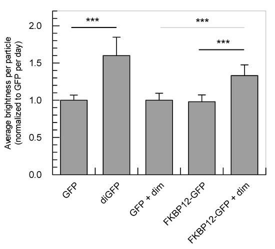 Average brightness calculated from analysis of multiple cells. The apparent brightness of several proteins was measured in living Dictyostelium cells and normalized to GFP per day. Averages were calculated from 24–35 cells per sample from 3 independent measurement days, as in Table 4. Error bars indicate standard deviations. FKBP12-GFP: GFP-linked dimerizing domain; +dim: cells have been incubated with 1 µM dimerizer for 3 h; *** p < 0.001.