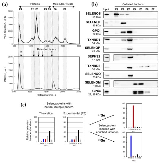 The presence of 10 important proteins in the selenoproteome expressed in HEK293 cells was assayed in each fraction by western immunoblotting (Figure 1b). In elution fraction F1, corresponding to the exclusion volume (V0) of the column, we detected the presence of SELENOS, a rather small protein (21 kDa) that was previously found in a large complex from the endoplasmic reticulum (ER) []. Obviously, other selenoproteins other than those tested here may participate in the selenium signal detected in F1. In F2, SELENOF (also known as Sel15 or Sep15) which is also an ER-protein was detected. SELENOF (15 kDa) associates with the UDP-glucose:glycoprotein glucosyltransferase (UGTR) to form a 150–kDa complex []. GPX1 and TXNRDs (TXNRD1 and TXNRD2) that form tetramers (~80 kDa) and dimers (~110 kDa), respectively, were observed in F2 and F3. Other selenoproteins studied here (SELENOP, SEPHS2, SELENOO, SELENOM, and GPX4) are believed [,] to be predominantly in the monomeric form, and therefore eluted in the expected respective fractions (see Figure 1 and Table 1).