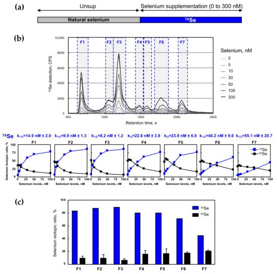 The selenium level in the growth media is known to modulate selenoprotein expression following a prioritized response, also called a hierarchy, but various selenium sources and concentrations have been used in the literature []. When 100 nM was added to the culture medium, the selenite induced a selective upregulation of the selenoproteins that was associated with an improved antioxidant defense []. Here, we aimed to define the optimal selenium levels (in the form of selenite) for each selenoprotein expression. To do so, increasing concentrations of 76Se-enriched selenite (from 5 to 300 nM) were added to the culture media after a preliminary selenium deprivation of the cells for three days, as illustrated in Figure 2a. In HEK293 cells, the toxic activity of selenite appears at concentrations higher than 1 µM []. At these higher levels, an adaptive response to selenium stress may occur. Cell extracts were harvested after three more days of incubation and analyzed by SEC-ICP MS, as mentioned above. The chromatograms (Figure 2b) showed that the ICP MS signal of 76Se increased in all fractions as selenium was added to the cell growth media. Interestingly, the highest selenium concentration used here (i.e., 300 nM) was not sufficient to reach a similar 76Se-isotope enrichment for all the selenocompounds (Figure 2c). Indeed, when a concentration of 300 nM of 76Se selenite was used, a 76Se-enrichment of 80–90% was observed for the protein fractions F1 to F5, while it reached 71% and 45% only in F6 and F7, respectively. This finding indicated a prioritized assimilation of selenium into the selenoprotein pool, with F3 being the most concentrated in terms of the newly synthesized selenoproteins. Then, the isotopic ratio in each fraction was calculated and plotted as a function of the added selenium. Only the most naturally abundant (80Se) and the supplemented isotope (76Se) are represented in Figure 2b. The curve-fit of the 76Se signal with a saturation equation gave us a half-saturation constant (k1/2) for each fraction (see Figure 2b). This value expressed the concentration of the added selenium which was necessary to exchange half of the natural selenium with the isotopically enriched element. The comparison of these different values provided the hierarchy of selenium assimilation into the different fractions. It appeared that selenium was primarily incorporated in the selenoprotein pool rather than in the metabolite fractions, with the following hierarchy: F2 and F3 > F1 > F4 and F5 > F6 and F7. Taken together, our data demonstrated that one cell passage of three days in selenium-supplemented conditions was sufficient to efficiently incorporate the isotopically enriched selenite in the newly synthesized selenoproteins.