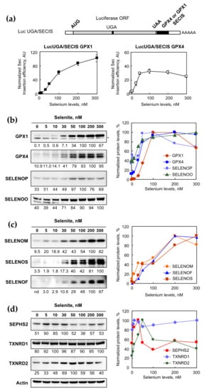 To complement this analysis individually at the selenoprotein level, we performed western immunoblots with the cellular extracts from cells grown in the presence of various selenium levels (76Se). Ten selenoproteins that are well expressed and readily detectable with validated antibodies in HEK293 cells were assayed [,], and the protein contents in every condition were normalized respective to actin levels. These normalized selenoprotein levels were plotted as a function of the added selenium in the media. It appeared that three main categories of selenium responses emerged from our experiments, as shown in Figure 3b–d. The first category included GPX1, GPX4, SELENOP, and SELENOO, the levels of which were sensitive to selenium variation and reached an optimal expression level at a 100 nM selenium concentration or lower (Figure 3b). The second category comprised SELENOM, SELENOS, and SELENOF, which reached a maximum expression only at a 200 nM selenium concentration or higher (Figure 3c). The first and second categories were similar and fall into the “stress-related” family of selenoproteins. The last category included “house-keeping” selenoproteins, namely SEPHS2, TXNRD1, and TXNRD2, and had a very distinct response to selenium supplementation. They were either sensitive to the selenium variation with an inverse U-shaped curve (SEPHS2 and TXNRD2) or barely sensitive (TXNRD1), as shown in Figure 3d. Taken together, our data confirmed that the selenoproteome was highly modulated by selenium level variation in HEK293, with a specific hierarchy, mostly controlled at the translation stage.