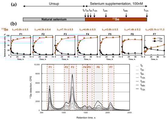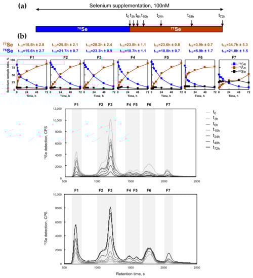 After having studied the response to selenium supplementation and having shown the ability to label the selenoproteome and selenocompounds with 76Se and 77Se enriched selenite, we then analyzed the half-lives of selenium in the different fractions detected by SEC-ICP MS, using constant conditions of selenium supplementation in the cell culture. To do so, we initially grew the HEK293 cells in 100 nM of 76Se selenite for three days and then passaged them into a fresh medium containing 100 nM of 77Se selenite, as illustrated in Figure 6. HEK293 cells were harvested at different time points (0, 3, 6, 10, 24, 48, and 72 h), and analyzed for the selenium isotopic composition by SEC-ICP MS as described earlier (see Figure 6b). The isotopic ratio was calculated in each fraction, and then plotted as a function of time. The signals of 80Se, 76Se, and 77Se were represented in the seven histograms above the chromatograms of Figure 6b. The signals of 76Se and 77Se were exponentially curve-fitted to extract t1/2, as described previously (see Figure 6a and Table 2). In almost every fraction, the deduced value of t1/2 was highly similar for the decrease in 76Se and the increased signal of 77Se, confirming the robustness of our method to label and trace the selenium signal in cultured cells. This t1/2 value indicated the rate by which selenium was exchanged in the molecules of each fraction, and was often referred to as the half-life. Indeed, at every time point, this value resulted from the balance between the neo-synthesis or intake (followed by the 77Se signal) and the degradation or secretion (followed by the 76Se signal). From our experiment, it appeared that F6 (metabolites) had the shortest half-life, below 6h. In contrast to that, fractions F2 to F5 containing selenoproteins had an average half-life of approximately one day (24 h). Interestingly, only F1 had a shorter t1/2 of 15 h, suggesting a variability within the selenoproteome. Again, a unique behavior was observed for fraction F7. The level of the initial 80Se stayed constant at 25% while 76Se and 77Se exchanged at t1/2 of 21 h and 35 h, respectively. These data suggest that only half of the selenium content in F7 was efficiently exchangeable, the other half is likely a long-term storage form of selenium. In summary, our data indicate that our strategy is efficient to label the selenoproteome with different isotopes and to trace the evolution within it. Note that the determination of the individual selenoproteins cannot be performed by western immunoblotting since antibodies are unable to differentiate between 76Se and 77Se.