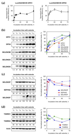 In order to obtain information about the kinetic hierarchy between individual selenoproteins, we performed a western immunoblot with the extracts harvested at different time points. Again, three categories of selenoproteins can be deduced from the kinetic behavior, as shown in Figure 5b–d. The first category may refer to the so-called stress-related selenoproteins, with a rather slow increase in protein expression in response to the selenium supplementation. This category, composed of GPX1, GPX4, SELENOM, SELENOO, and SELENOS (Figure 5b), reached the maximum expression between 48 and 72 h. In contrast to that, the second category of selenoproteins, composed of SELENOP, SEPHS2, and SELENOF (Figure 5c), was characterized by a rapid and massive stimulation of protein expression, with maximal expression at 6 h for SELENOP or after 10 h for SELENOF and SEPHS2. Note that a decrease in the protein expression was observed at 72 h in the case of SELENOP and SEPHS2. This biphasic kinetic may reflect a negative feedback control of gene expression. The third category of selenoproteins, composed of TXNRD1 and TXNRD2 (Figure 5d), was poorly regulated over time by selenium supplementation and can be clearly associated with “housekeeping” selenoproteins. Taken together, our data indicated that the selenoproteome was highly regulated by selenium supplementation in HEK293, with specific individual kinetics.