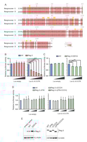 Reg-3 is involved in the 3′UTR-dependent destabilization of transcripts. (A) NYN/PIN and CCCH-zinc finger domain of Reg-3 contain all key residues essential for nuclease activity. Alignment of the NYN/PIN domain and CCCH-zinc finger of Reg-1 and Reg-3. The yellow triangles indicate the aspartic acid residues critical for binding of magnesium ion. The yellow line indicates the CCCH-zinc finger domain with three cysteine and one histidine residues indicated with hexagons. The asterisks denote the positively charged amino acid residues crucial for the binding of the negatively charged backbone of the substrate RNA. The alignment was performed using ClustalW2 [] using the default settings and visualized using Adobe Illustrator 2020 (Adobe). (B–E) U251-MG cells were transfected with vectors coding for luciferase with attached IL-6 3′UTR (Luc-IL-6-3′UTR) or without any attached 3′UTR (Luc-empty) and varying amounts of Reg-3 wild-type (B), 10 to 160 ng/well in twofold increments) or Reg-3 D251A point mutant (C), 20 to 80 ng/well in twofold increments) or an empty control pcDNA3 vector (ctrl). (D) U251-MG cells were transfected with vectors coding for luciferase with attached IL-6 3′UTR (Luc-IL-6-3′UTR) or without any attached 3′UTR (Luc-empty) and varying amounts of Reg-3 muteins (ΔPIN, ΔCCCH or ΔPIN-CCCH, 20 to 80 ng/well in twofold increments) or an empty control pcDNA3 vector (ctrl). (E) The expression level of wild-type Reg-3 (WT) and specified muteins (D251A, ΔPIN, ΔCCCH or ΔPIN-CCCH) was examined by western blotting. Representative image of three independent experiments with similar results is shown. The presented graphs show the mean results of three independent experiments ±SD. The data were analyzed using one-way ANOVA (B,C) or two-way-ANOVA (D) with Bonferroni’s post-hoc test ([**] p < 0.01; [***] p < 0.001).