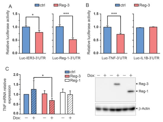 Regulation of known Reg-1 substrates and TNF by Reg-3. (A,B) U251-MG cells were transfected with vectors coding for luciferase with attached 3′UTRs of known Reg-1 substrates (IER3, Reg-1 and IL-1β) and TNF (Luc-IER3-3′UTR, Luc-Reg-1-3′UTR, Luc-IL1B-3′UTR and Luc-TNF-3′UTR respectively) and Reg-3 or empty (ctrl) expression vectors (20 ng/well). (C) U251-MG cells with Dox-inducible expression of Reg-3, Reg-1 and luciferase (ctrl) were stimulated for 24 h with 10 ng/mL of Il-1β and then treated with Dox for 5 h or left untreated. The expression level of TNF mRNA was examined using RT-qPCR. The expression of Reg-3 and Reg-1 was verified by western blotting. Representative image of three independent experiments with similar results is shown. The presented graphs show the mean results of three independent experiments ±SD. The data were analyzed using one-way ANOVA (A,B) or two-way-ANOVA (C) with Bonferroni’s post-hoc test ([*] p < 0.01; [***] p < 0.001).