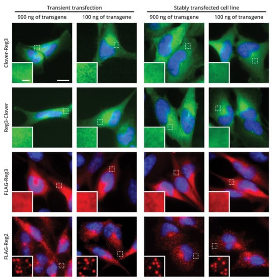 Reg-3 is a protein diffusely localized in the cytoplasm. Transiently (left panels) or stably (right panels) transfected U251-MG cells with indicated amounts of transgenes used per 1 µg of total DNA used for transfection (Clover-Reg-3, Reg-3-Clover, FLAG-Reg-3 or FLAG-Reg-2) were fixed and visualized under fluorescent microscope. The DNA was counterstained using DAPI (blue). Scale bars: main images: 10 µm, zooms: 1 µm.