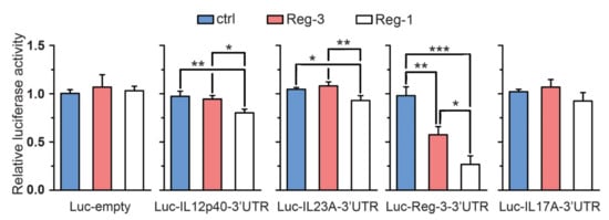Regulation of psoriasis-related transcripts by Reg-1 and Reg-3. Cells were transfected with vectors coding for luciferase with attached 3′UTRs of mRNAs related to psoriasis (IL-12p40, IL-17A, IL-23A, and Reg-3) or empty control plasmid (Luc-IL12p40-3′UTR, Luc-IL17A-3′UTR, Luc-IL23A-3′UTR, Luc-Reg-3-3′UTR and Luc-empty respectively) and Reg-3, Reg1 or empty (ctrl) expression vectors (20 ng/well). The presented graphs show the mean results of three independent experiments ±SD. The data were analyzed using one-way ANOVA with Bonferroni’s post-hoc test ([*] p < 0.5; [**] p < 0.01; [***] p < 0.001).