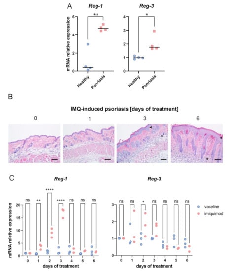 Psoriasis is a complex disease that evolves in time, and Reg-3 as well as Reg-1 might be associated with specific stage(s) of the disease. We employed experimental, imiquimod (IMQ)-based model of psoriasis [], that allowed us to analyze psoriasis-associated expression levels of Reg-3 as well as Reg-1 in a kinetic-dependent fashion. Vaseline-treated skin was used as a control. Histology of skin samples collected at day 0, 1, 3 and 6 after application of IMQ confirmed psoriasis-like changes in this model, such as skin thickening and robust skin infiltration (Figure 5B).