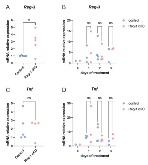 Psoriasis is associated with dramatic alterations in proliferation and differentiation of keratinocytes, a dominant cell type in epidermis [,]. Given that Reg-3 mRNA is degraded by Reg-1 in vitro (Figure 4), more robustly upregulated Reg-1 mRNA levels compared to Reg-3 transcript levels in the skin of IMQ-treated mice suggested that Reg-3 might be constantly or transiently downregulated by Reg-1, especially in keratinocytes, which are functionally strongly dependent on Reg-1 []. Indeed, we found that keratinocyte-specific Reg-1 knockout mice (Reg1 cKO) [] demonstrated significantly elevated Reg-3 levels at baseline compared to control mice (Figure 6A).