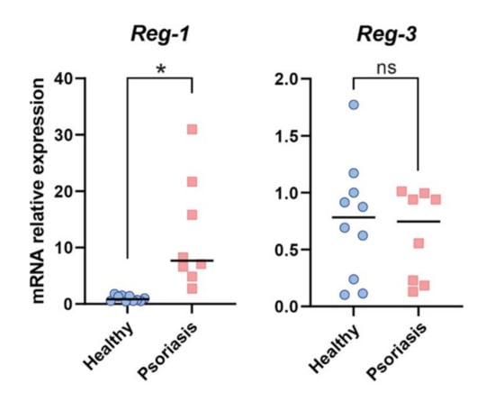 Nevertheless, substantial differences in Reg-3 mRNA levels were noted in epidermis of both healthy donors and patients with psoriasis as well as in Reg-1 in individuals suffering from psoriasis (Figure 7).