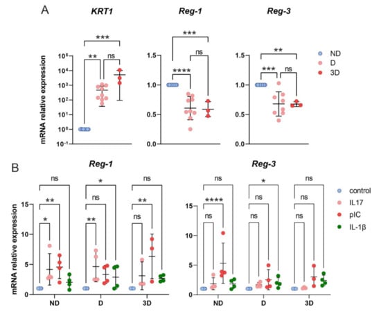 Reg-3 is expressed in human keratinocytes in proliferation-dependent manner. (A) Human keratinocytes were grown in the indicated cultures and subjected to RNA isolation followed by RT-qPCR. The expression data of the indicated genes was normalized to GAPDH and presented relative to undifferentiated keratinocytes (ND) as data points and the mean value in each group (bars), n = 3–9 independent donors. (B) Poly(I:C), an analog of viral dsRNA increases Reg-3 expression in mitotically active human keratinocytes. Human keratinocytes grown in the indicates cultures were treated with 200 ng/mL IL-17, 10 ng/mL IL-1β and 10 µg/mL poly(I:C) for 24 h. Total RNA was subjected to RT-qPCR. Relative expression of Reg-1 or Reg-3 in stimulated cells over control is shown as the mean from three independent experiments. * p < 0.05, ** p < 0.01, *** p < 0.001, **** p < 0.0001, ns = not significant by ANOVA followed by a Bonferroni post hoc test.