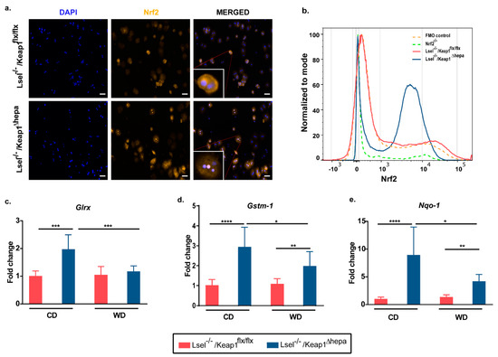 Lsel−/−Keap1Δhepa mice exhibit increased Nrf2 expression and an upregulation of Nrf2 target genes in the liver. (a) Representative immunofluorescence staining images indicate nuclear translocation of Nrf2 in hepatocytes of Lsel−/−Keap1Δhepa mice. Hepatocytes of untreated mice were labeled with anti-Nrf2 (orange) and DAPI (blue). Scale bar: 50 µm. (b) Representative flow cytometric analysis indicates increased Nrf2 in hepatocytes of Lsel−/−Keap1Δhepa mice. (c-e) Levels of the mRNAs indicated were measured in liver tissue of Lsel−/−Keap1flx/flx mice (red bars) and Lsel−/−Keap1Δhepa mice (blue bars) after 24 weeks of feeding with chow diet (CD) or Western diet (WD). mRNA levels are expressed as fold increase over the mean value obtained for healthy control liver tissue from Lsel−/−Keap1flx/flx mice. (Lsel−/−Keap1flx/flx CD-fed (n = 6), Lsel−/−Keap1flx/flx WD-fed (n = 12), Lsel−/−Keap1Δ hepa CD-fed (n = 4), Lsel−/−Keap1Δhepa WD-fed (n = 8). (c) Glrx (glutaredoxin), (d) Gstm-1 (glutathion S-transferase1) (e) Nqo-1 (NAD(P)H quinone dehydrogenase 1) Statistical significance was calculated by the one-way ANOVA (analysis of variance). Values are represented as mean SD. * p 0.05, ** p 0.01, *** p 0.001, **** p 0.0001.