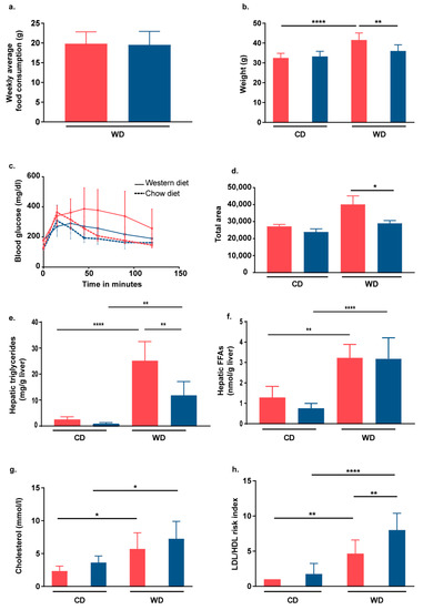 Western diet (WD) treatments were performed with 9–15-week-old male mice weighing at least 25 g. Mice were fed first chow (9 kcal % fat, 24 kcal % protein, 67 kcal % carbohydrates) (ssniff, Soest, Germany, rat/mouse–maintenance) or WD (40 kcal % fat (vegetable fats, 20 kcal % fructose, 2% cholesterol) (Brogaarden, Lynge, Denmark; cat. no. D09100301) for 24 weeks. Food intake and body weights were measured weekly. All experiments were repeated in two independent experimental setups.