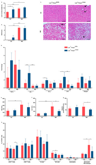 Under conditions of chow feeding, Lsel−/−Keap1Δhepa mice displayed an increased liver/body weight ratio when compared to Lsel−/−Keap1flx/flx mice. This was not unexpected, because an increased liver/body weight ratio has already been described in mice with hepatocytic Keap1 deletion [33]. After 24 weeks of WD feeding, liver/body weight ratios in both mouse strains were significantly elevated with respect to their chow-fed controls, but they did not differ significantly between Lsel−/−Keap1flx/flx and Lsel−/−Keap1Δhepa mice (Figure 3a). Histological analysis of the liver using H&E staining revealed a significant increase in hepatocyte ballooning with micro- and macrosteatosis in both mouse strains after 24 weeks of WD but no difference between Lsel−/−Keap1flx/flx and Lsel−/−Keap1Δhepa mice (Figure 3b,c). Lsel−/−Keap1Δhepa mice had a slightly increased NAFLD activity score (NAS) under conditions of chow diet, which was not significant when compared to similarly fed Lsel−/−Keap1flx/flx mice. We also analyzed the expression levels of genes that are known to change during NAFLD progression via RT-PCR from liver tissue homogenates. In addition to a small decrease in interleukin-6 (IL-6) mRNA and a trend toward increased Forkhead box P3 (FoxP3) levels in Lsel−/−Keap1Δhepa mice, which was not significant, WD feeding did not cause a change in inflammatory gene expression in the livers of either mouse strain. However, under basal conditions of chow feeding, Lsel−/−Keap1Δhepa mice did show an increase in gene expression in the pro-inflammatory mediators interferon-γ (Ifn-γ), Il-1β, and Il-6 (Figure 3d). Although we did not observe any difference in NAS scores between WD-treated Lsel−/−Keap1flx/flx and Lsel−/−Keap1Δhepa mice, the plasma levels of both alanine aminotransferase (ALT) and aspartate aminotransferase (AST) were found to be significantly increased only in Lsel−/−Keap1flx/flx mice. This may suggest that Nrf2 activation protects Lsel−/−Keap1Δhepa mice to some extent from liver damage (Figure 3e,f). In line with these results, after 24 weeks of WD treatment, Lsel−/−Keap1Δhepa mice exhibited significantly decreased levels of alkaline phosphatase (ALP) when compared to their similarly treated Lsel−/−Keap1flx/flx littermates (Figure 3g). Increased intrahepatic inflammatory immune cell immigration is a characteristic feature of progressing NAFLD. Therefore, we performed flow cytometric analysis of different liver immune cell populations. Detailed analysis of major leukocyte groups included CD4+ T cells, CD8+ T cells, B cells, NK cells, neutrophils, and monocytes/macrophages. Under chow diet conditions, we could not find any striking alterations in the frequencies of these cell populations caused by the Nrf2 activation. As expected, we observed only very low frequencies of neutrophils, which can be attributed to the L-selectin-deficiency, in both mouse strains [19]. WD feeding resulted in increased CD4+ T cell frequencies in the livers of Lsel−/−Keap1Δhepa mice and decreased CD11b+F4/80+ monocyte/macrophage frequencies when compared to Lsel−/−Keap1flx/flx littermates (Figure 3h). Whereas CD4+ T cells are mainly thought to provide protection from WD-induced pathologies [38], monocytes/macrophages seem to be central players in the progression of NAFLD [39].